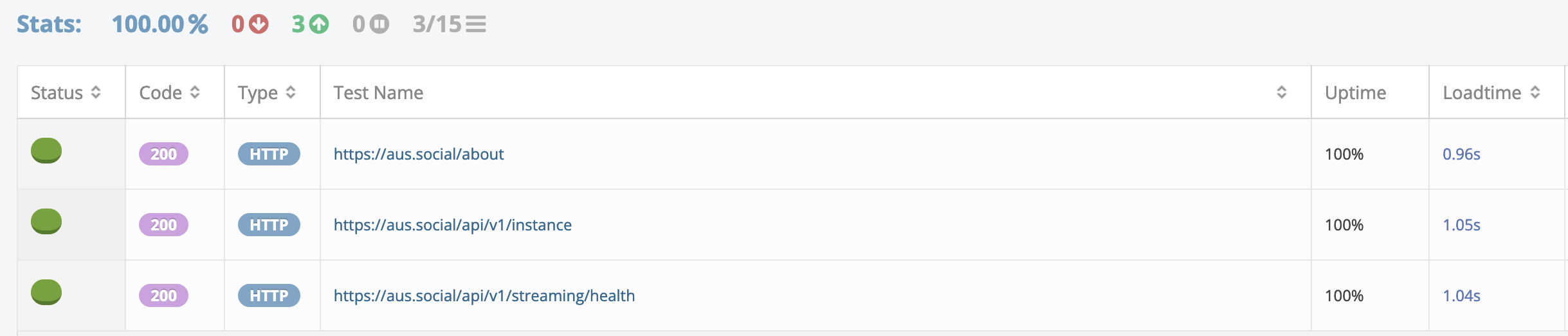 I'm running a monitoring service called statuscake.com to test my mastodon endpoints every 5 minutes and respond that the services are all online.